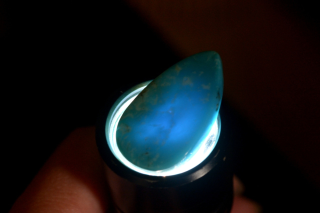 その為、本来不透明であるはずのターコイズにも関わらず光を透過するほどの明るさと奥行きのある色合いを兼ね備えています。